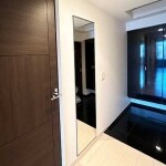 玄関側から見ると、新しく設置した上下ステンレスフレームの姿見は、W500XH1800の大き目サイズですが、周りの雰囲気に自然な仕方でなじんでいます。