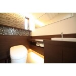 まず内装は石目のグレーのフロアタイルを採用し、トイレ背面の腰壁と手洗い横に造ったカウンターを同じ面材で統一しました。 トイレの背面にアクセントとして設けた調湿と消臭の効果があるエコカラットとモザイクタイルで上質な空間を演出しているのも魅力です。 トイレの横の壁には横長の鏡を設置し、より広々としたシックな雰囲気を作り出しています。