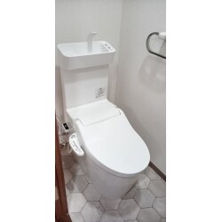 タンクレストイレにスリムタイプの手洗いボールが付いたコンパクト設計でゆとりが生まれる商品へ交換しました。 便器は、水族館の水槽や航空機の窓にも使用している素材で、陶器と違い細かい傷がつきにくく、ぬめりや水アカがたまりにくいです。水流をコントロールする形状で、ぐるりと洗い、少ない水量で高い洗浄力を発揮。洗浄力と節水の両立を実現しています。 手洗いは有機ガラス系素材を使用。汚れの元となる水をはじき、表面の黒ずみやぬめりがつきにくく、高い耐久性が特長です。手がさっと届く傾斜したボールでスムーズに手洗いできます。 ご納得の価格でクロスとクッションフロアも交換。カタログよりお好みの柄をお選びいただき、明るくきれいな空間になりました。