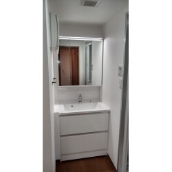 洗面のすぐ横に分電盤があり、分電盤の位置の変更が可能か、提案できる商品があるか相談したいとのことでした。 現在のサイズが現在主流のものではなく、壁面に密着しているタイプ。 鏡を残して下台のみ交換するか、分電盤を移動して新しい洗面台を入れるかご検討でした。 クロス、タオル掛けは交換したい。 洗濯パンは交換する必要があるか見てほしいとのことでした。