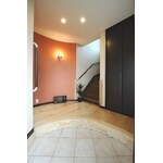 最大のポイントがリビングの出角の処理で様々な検討の結果、僅か0.4㎡ですが増築し、ホールの一部も取り込みました。1階に寝室を確保し、尚且つ水廻りの移動で理想的な配置になりました。ソファ、テレビ、テーブル、キッチン、収納がぴったり収まり、最小の費用で最大の効果を挙げることに成功しました。玄関ドア脇のデッドスペースに0.4㎡増築しました。曲面のアクセントウォールにし、色と照明を配してホールを広く見せる効果を持たせました。猫を飼っているので、爪とぎ用の木を階段上り口のコーナーに設けました。