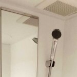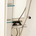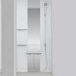 全身を映せる切り換えツートーンミラーのシンプルなデザインはお洒落なシャワールームを演出するだけでなく、お掃除のしやすさにもつながります。床の素材も、乾きやすく、滑りにくく、スポンジでひと拭きのお掃除しやすい床になりました。