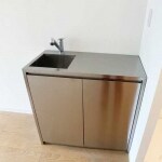 確かに中途半端にキッチンスペースが確保されていても、使いきれないのが現状かと思います。かえってあまり自宅で料理をされない方をターゲットに、電子レンジが置け、簡単な洗い物が出来れば十分なもののイメージでお探しいたしました。ご紹介させていただいたのがオールステンレスの“超小型”キッチンVANO(バーノ)です。ステンレスは、加工一筋50年以上の老舗工場で熟練の職人が仕上げています。シャープなスクエアデザインと素材にこだわった職人の技が光る逸品で収納スペースも広く取られステンレスならではの清潔感を保ちます。使いやすいワンプッシュ開き戸タイプで、しっかりナイフホルダーが付いています。お部屋のインテリアの一部としてもおしゃれな雰囲気をプラスするデザイン性があるアイテムでしたので、キッチンとしての枠にはめない設置方法をご提案させていただきました。