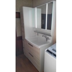 台風の浸水被害により、化粧台の扉等が傷んでしまったため、洗面化粧台自体を交換したい。
