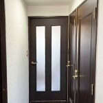 ドアを交換いたしました。以前は透明ガラスで玄関からお部屋がそれとなく見えてしまうのが気になっておられましたが、透きガラス2枚のものに変え、あかりがより取れるものにしました。既存のドアのイメージと会う色・素材を選ばせていただきました。(廊下側からリビング側を望む)