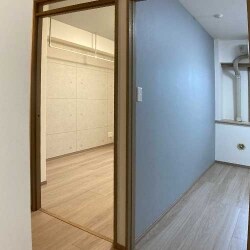 ウォークインクローゼット側から周りの状態を見た写真です。右側が今回二つに分けたお部屋があり、そのお部屋の片引き戸が入って来る隙間が見えます。奥に玄関と廊下が見えます。左に洋室のお部屋の片引き戸が閉まった状態が見えます。