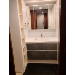 洗面化粧台とユニットバスの入替えをしました。 洗面台はぴったりサイズの洗面台タカラスタンダードのリジャストを採用しました。洗面台の横の壁はホーロー内装材になっているため、マグネットがくっつきます。ハンドソープや歯ブラシなどを浮かせてスッキリと収納することができます。 ユニットバスはタカラスタンダードのグランスパを採用しました。おそうじや整理のしやすさにもこだわり全体的にすっきりフラットなデザインに。 ゆったりとくつろげる浴室へと生まれ変わりました。 入口の段差解消と幅も広くなりました。