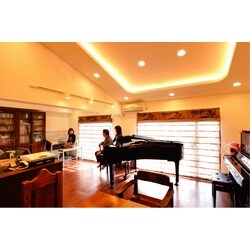 このマンションに入居したのは27年前の新築時。 浴槽の底に穴が空いたり、壁のクロスが剥がれるなど、経年による劣化が目立ち始めていた。愛着あるこの部屋でもっと心地よく暮らしたい。 そんな想いで家の全面リフォーム。 まず「生活のメインとなるLDKをとにかく広く取りたい」との思いから隣接していた6畳の和室との仕切りを取り払い、一間続きの広いLDKを確保。 そのため、ダイニングテーブルの位置から元・和室部分の窓を眺めることができるほど、ゆったり感が増した。 ピアノ講師のお嬢様にとって、グランドピアノとアップライトのピアノ、エレクトーンを3台とも一つの空間に収まるようになったのもうれしい点。 構造上問題ない天井に勾配を付けることでさらなる開放感を得ることに成功。 内側にライトを取り付けて間接照明にすることで、ゆとりの高級感を与える効果も。