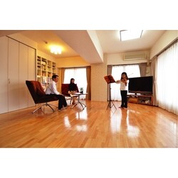 デンマーク製のイージーチェアに身を委ねつつ、娘さんの奏でるバイオリンに耳を傾けるご夫婦。以前は中央の梁から左側は和室だったが、一つづきに間取り変更して広々としたLDKに。濃い茶色だった床はかすかにピンクがかったサクラに張り替え、カーテンもグリーンからナチュラルカラーに。あえて色みを抑えたコーディネートでリラックス感が増した。