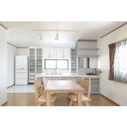 築40年の昔ながらのキッチンが、輝くような明るいLDKに大リフォーム。防水タイルでバリアフリーの床、大型ガラスサッシが光も風も通して、採光と換気も十分確保。 リビング部分にあった食器棚などの荷物は、キッチン壁側の窓下に作った大容量収納へすっきり収めました。一か所につくることで効率の良いスペース確保ができます。 狭かった食事の場が、広くて明るくなって、家族がゆったり楽しく会話できるように。料理も一層おいしく味わえます。