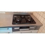 使いやすい三口コンロと両面焼きグリルへ交換しました。 トッププレートはホーロー仕様。 汁受け皿のないシンプルな構造で、お掃除もラクラクです。 プッシュ&レバーで操作が簡単です。