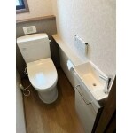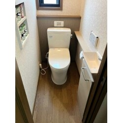 2階建てお宅のトイレをリフォーム致しました。 1Fウォシュレットを2Fトイレへ移設したいとのご要望があったので、ウォシュレットは再利用し、新規の便器と手洗カウンターをリフォームしています。