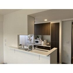 リフォーム済みの中古マンションを購入したが、小窓はあるだけでキッチンが閉鎖的な事と食洗機がないのがお困り事でした。 広々とした対面キッチンカウンターと食洗機の導入をご希望でした。 具体的なご要望としては、袖壁の取り壊しと吊り戸棚を撤去までは決まっていましたが、カウンターの出幅や正面の壁をどこまで壊すかは、現地調査時にお打合せして進めていきました。