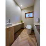 間取りを少し変えて、トイレのスペースを広げます。従来の旧式タンクのトイレからタンクレス式のトイレへ。タイル張りの床をヘリンボーン柄のクッションフロアへ。温かみのあるトイレ空間へ。