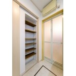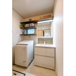 キッチンのスペースを洗面室へ間取り変更して収納スペースを確保し、洗濯機上に造作棚を新設します。