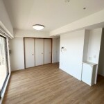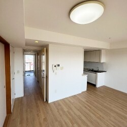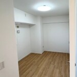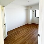 違う画角から見たお写真。濃い目の色合いのフローリング。壁紙は、当社現状確認時、お客様の方で剥された状態でした。