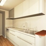リビングに合わせ、同じ素材でフローリングと壁紙を貼り替えさせていただきました。色味が明るくなって木目調が際立ち、真っすぐ流れる模様が整然とすっきり整ったイメージと温かみを作り出しました。システムキッチンの交換はありませんでしたが、片方のキッチン水栓を引き出し式のホースが付いた節水タイプの水栓に交換させていただきました。