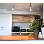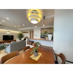 吊り戸棚を外したことでリビングとの一体感がうまれました。カウンター上にも照明設置することで手元も明るく、お部屋全体のポイントにもなります。またラクエラのカップボードを背面新設し、今までの開き扉のキッチンがスライド式になったことで大容量の収納が出来るようになりました。