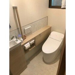 お引越しをきっかけに、トイレのリフォームをお任せいただきました。 すっきりとした空間を目指し提案した商品は、TOTOのGGです。小型のタンクが便座と一体型形状で、見た目もスッキリ。拭き掃除の際にもストレスフリーな形をしています。 タイル貼りの内装はクロスとクッションフロアへ変えることで、内装の印象ががらりと変わりました。 手洗いカウンターと並行に、施主様のご希望で加えたパネルが空間にアクセントをプラス。手洗いカウンターの収納に加え、コーナーキャビネットを設置することで収納の充実も叶えました。 使い勝手が良くなった綺麗なトイレ空間に、大変お喜びいただくことができました。