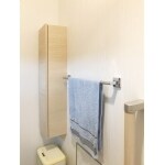 手洗いカウンターの収納に加えてコーナーキャビネットを取り付けることで、収納スペースを充実させました。