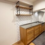 モザイク柄のタイルに、用途によって使い分けられる2種類の棚が設置されていました。壁面にガスコンロ・シンク・食洗器が付いた一般的な1型の設置タイプでした。ガスコンロの上にも棚が設置されていました。