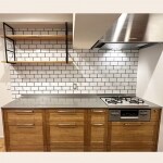 吊戸を付けずに、お洒落に飾れるオープン棚を提案しました。キッチンは2型として、壁面はガスコンロキャビと作業スペースを広げました。存在感のあるスクエアステンレスのレンジフードと、黒目地の白いサブウェイタイルがデザイン性を引き立てています。大人カッコいい天然無垢の洗練された癒しのキッチンになりました。