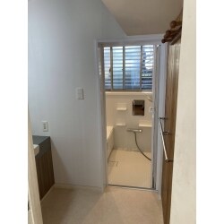 1.在来工法(壁・床ともにタイル仕様)の浴室から、断熱性能の高いユニットバス仕様にリフォーム。(段差も解消) 2.浴室窓を断熱仕様に交換。 3.脱衣室の床面の改修(断熱材設置など)および洗面台収納扉の改修など。