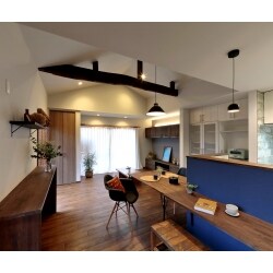天井は梁見せにして、オープンでエアリーな空間に。カウンターキッチンのクロスは目を引く鮮やかなブルーで海岸風スタイルのお部屋がぐっとひきしまります。