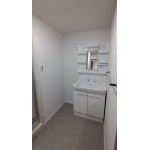 洗面台は同じサイズに交換し、位置を右側に寄せてお取り付けしました。 お持ちの収納棚を置かれるということで、スペースをご活用できるようにしました。