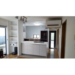 エアコンが取りつけられている垂れ壁部分のみ残して対面キッチンになるよう提案しました。・コンロ裏(リビング側)は筋交いがあり撤去できなかったので収納を造作しました。中には可動棚を取りつけてフレキシブルに使用できるようにしています。収納下部にはルンバが格納できるように扉は短くしています。