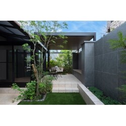 全てをやりかえるのではなく、ガーデンルームは残し、利用価値の上がるよう+Gルーフを延長し、色味を合わせながら上手く周りと融合させました。あまり閉鎖感の出ないように格子やフレーム、緑をふんだんに使用し、奥行き感のある、落ち着いたお庭をご提案。隣地を背面にウォールを設置。緑に囲まれた癒しのプライベート空間に仕上げました。自然石調のタイルが重厚感と存在感を発揮し、+Gルーフがラグジュアリーなテラス空間を演出。テラス屋根はLIXILの+Gルーフを設置。ダウンライトを取り付けナイトガーデンも楽しめます。
