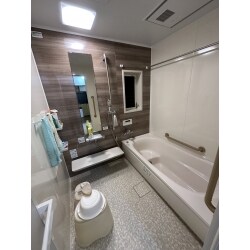 TOTOサザナのバリアフリーのユニットバス、浴室暖房換気扇を取り付けました。 広くて快適なバスルームになりました。 ブラウンとホワイトを基調にした落ち着く空間となっているため、バスタイムを快適に、楽しんでいただけます。 浴槽も広く、全身浸かれる為、体の疲れも良く取れそうです。