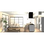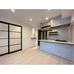 クローズドキッチンを対面キッチンに変更。LDKを広げて、くつろげるリビングスペースに。隣室との間仕切りは、光を取り込めるアクリルパネルの黒フレームドアで部屋のアクセントにもなるように。