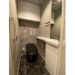 マット黒のタンクレスに変更。 手洗いはそのままに、縦長のミラーを新調。 落ち着いたトーンでダークにまとめてます。