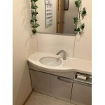 トイレと自動水栓、どちらも丸みを帯びた形が奥様が気に入ってくださいました。自動水栓は発電タイプなので電源が無い場所でも設置できます。機械部分の重量があったため、台を設けて既存の給水管に負荷が掛からないように設置しました。