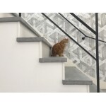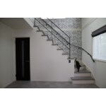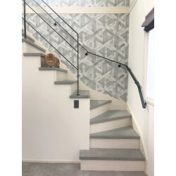 ジオメトリック柄を大胆にあしらったクロスに変更。踏板もモルタル左官塗材のグレーで統一。手すりもブラックのアイアンに替えてシックで落ち着きのある雰囲気に。