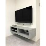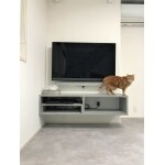 テレビは置き型から壁掛けに、テレビボードをフロータータイプに。フローリングとテレビボードもグレーのモルタル左官材を施して統一。
