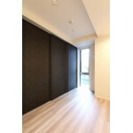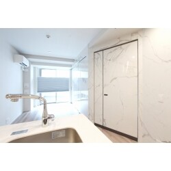 既存の間仕切り壁を撤去して、フレームレスの3枚引き戸とFIX+ドアを設置しました。 壁と建具は同じ大理石で仕上げ、空間に高級感と一体感を生み出しています。 壁が鈍角の部分や、天井高が変わる部分が何箇所かありましたが、見切りの無いすっきりとした納まりとなるよう努めました。 寝室側の建具は、ブラウンのレザー張りとしてお部屋のアクセントの役割も担っています。