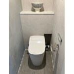 1、2階のトイレはどちらも全自動おそうじ機能付きのPanasonicアラウーノ。 床はLDKと同じPanasonic ラピスタイルフロアです。ラピスタイルフロアのモルタルグレーに合わせて、壁のクロスもグレー系でコーディネート。落ち着いた清潔感のある空間になりました。