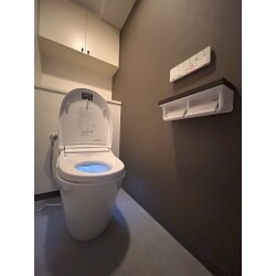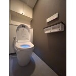 老朽化したトイレを、すっきりとした形にグレードアップさせたい!とリフォームを承りました。 凹凸の少ないフォルムをお気に召されてサティスのSタイプを選定。マンションへの設置であったため事前に水圧検査を行い、充分な水圧であることを確認してから工事に取り掛かりました。 シックながらも暗すぎない内装を目指し、アクセントクロスにはダークブラウンを採用。見える面積が広いサイドへと施工したところがポイントです。クッションフロアには空間に馴染むグレーを。ハニカムコンク柄で流行を取入れました。 内装の交換に伴い、ペーパーホルダーやタオル掛けなどのアクセサリーの交換を合わせて提案。空間全体がまとまり、落着きのあるシックな雰囲気になりました。