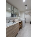 壁をなくし、化粧台カウンターを伸ばしたことで広く明るくなり、収納スペースも確保できるようご提案をさせて頂きました。