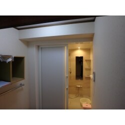脱衣場改修後 段差解消。 片引き戸に変更し入口開口を広くした。 床の嵩上げ、断熱材設置。