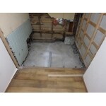 脱衣場改修前 風呂・脱衣場の段差が約10cm以上。 現行は開き戸の為、開口部が狭かった。 床に浸水跡あり。
