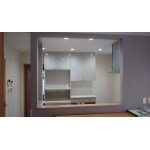 構造上抜くことが出来ない柱を残して垂れ壁と吊戸棚を撤去しました。クロスと梁・柱を一緒の色にしていますので統一感があります。照明もブラケットからダウンライトに交換しています。