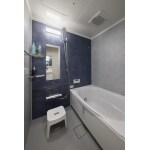 システムバスは、くすみブルーのアクセントパネルが目をひく空間になっています。 浴槽は肌触りのいい上質な質感で、保温効果も抜群です。毎日、最高級のバスタイムを満喫いただけます。