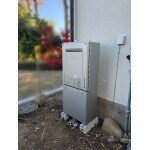 施工後写真。配管関係はすべて地中埋設に変更して。水栓バルブの位置も変更したので、給湯器周りの配管がとてもスッキリしました。