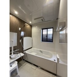 アクセントパネルを茶系のノルディックベージュに、全体をホワイトでまとめて柔らかいイメージの浴室になりました。