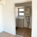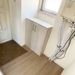 一旦スケルトンにし、給湯給水配管更新後、間取りの変更により洗濯機置場を室内に確保しました。お部屋側から洗濯機置場、トイレ・浴室に通じる導線にいたしました。和室押入をクローゼットにして洋室に変更し、二つのお部屋を仕切る扉はトールサイズの大きな扉を採用して、お部屋を広々爽やかな雰囲気になるようデザインしました。