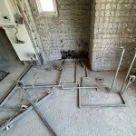 全面タイル張りの寒くてお掃除の大変な浴室・トイレ・洗面スペースでした。給水・給湯の配管は壁面に出る感じで設置されていました