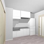 配管を床面に組み替え、賃貸用の新しいシステムキッチンを配置しました。キッチンパネルがアクセントデザインになっています。フローリングと扉などの建具をベリティスのお洒落なグレージュの色合いで包み込んで優しい統一された空間を演出しています。